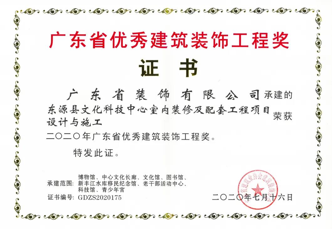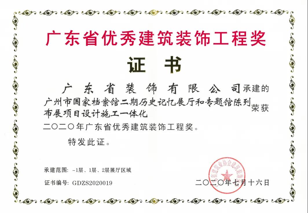 2020年7月16日,廣東省裝飾有限公司共四項(xiàng)竣工項(xiàng)目被廣東省建筑業(yè)協(xié)會(huì)建筑裝飾分會(huì)評(píng)選為“2020年廣東省優(yōu)秀建筑裝飾工程”。