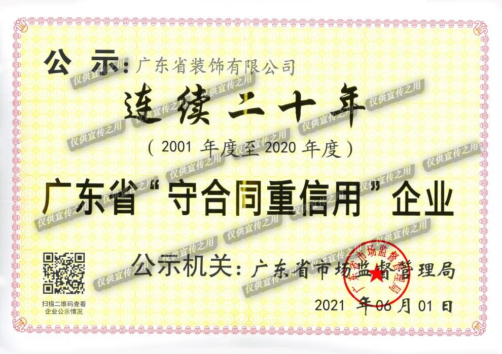 祝賀廣東省裝飾有限公司在2021年6月1日榮獲由廣東省市場監(jiān)督管理局頒發(fā)的“廣東省守合同重信用企業(yè)證書”。 同時(shí)廣東省裝飾有限公司一直保持著從2001年度至2020年度連續(xù)二十年榮獲該獎項(xiàng)。今后我司將再接再厲,繼續(xù)做好行業(yè)中的企業(yè)榜樣。